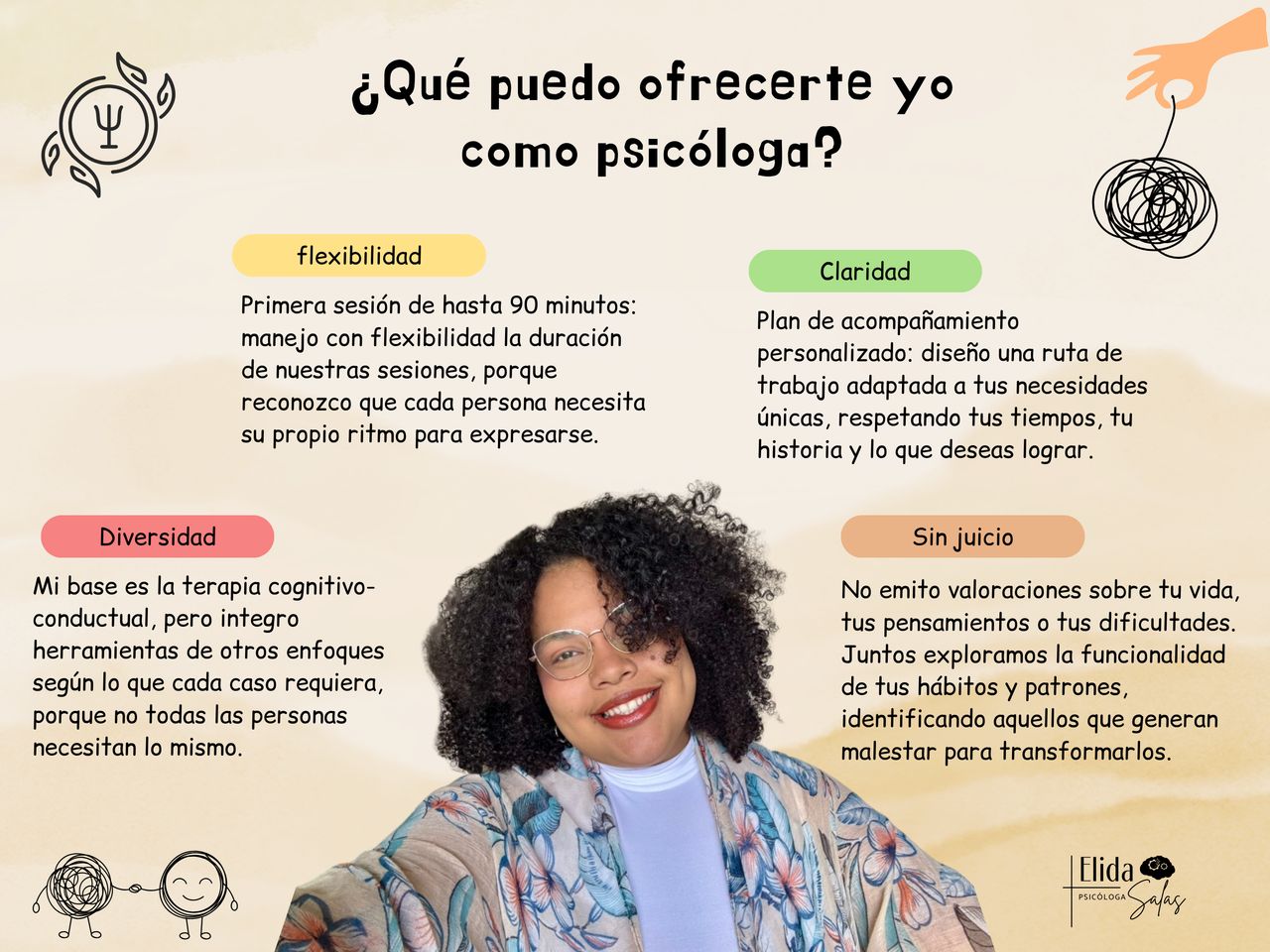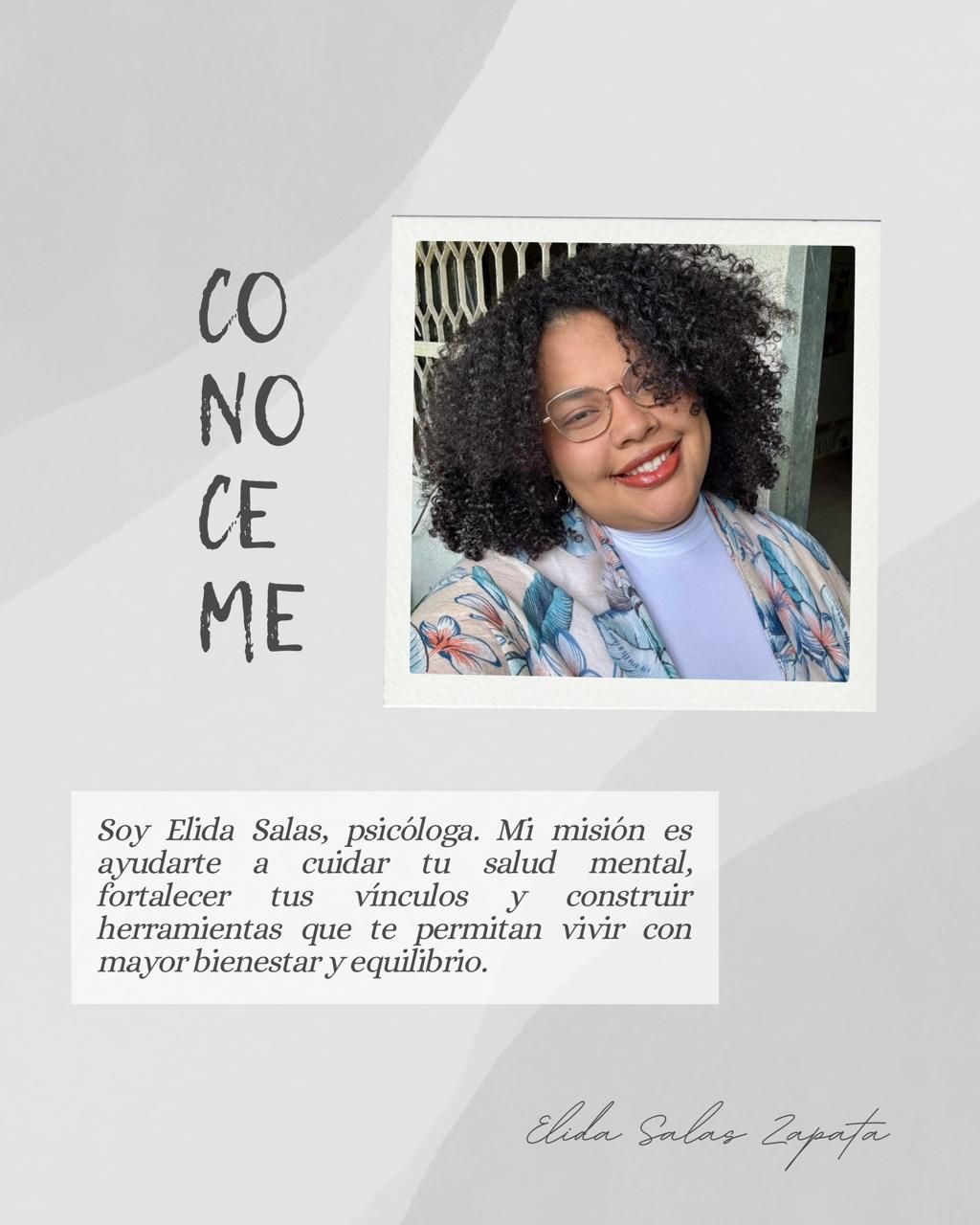 Soy Elida R. Salas Zapata, psicóloga dedicada a la atención de adultos y parejas, con un enfoque terapéutico que combina calidez, claridad y un profundo respeto por las historias y ritmos de cada consultante. Mi trabajo se centra en crear espacios seguros, donde las personas puedan comprenderse, sanar, fortalecer sus vínculos y construir herramientas emocionales que les permitan vivir con mayor bienestar y autenticidad.